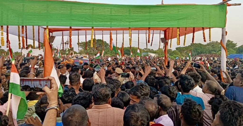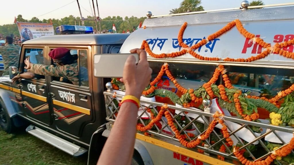 মহঃ সফিউল আলম, রাজনগর, বীরভূম: কাশ্মীরে কর্তব্যরত অবস্থায় শহীদ হন বীরভূমের রাজনগরের কুন্ডিরা গ্রামের সেনা জওয়ান সুজয় ঘোষ। শনিবার তাঁর কফিনবন্দি দেহ আনা হয় গ্রামে। গ্রামের মাঠে হাজার হাজার মানুষ শেষবারের মতো দেখতে ভিড় জমান, স্লোগানে মুখরিত হয় চারদিক “বীর শহীদ সুজয় ঘোষ অমর রহে”।